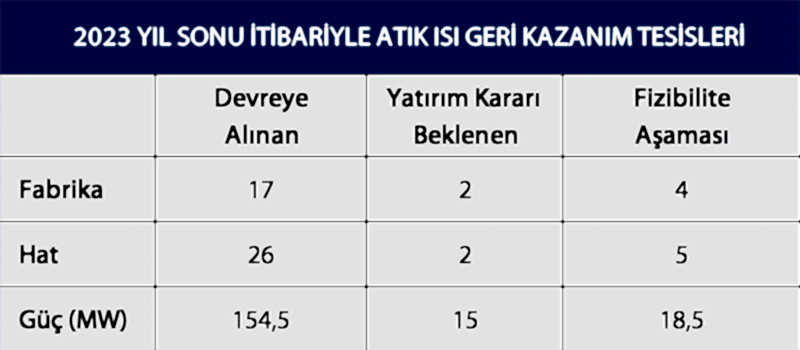 Fizibilitesi genel olarak hammadde rutubeti, elektrik fiyatı, çimento tüketimi, ülke politika ve stratejileri ile enerji arz güvenliği gibi alt başlıklara dayanan atık ısı geri kazanımı tesisi yatırımlarından devreye alınanlar 2023 yıl sonu itibariyle 17 fabrikada 26 hat ile toplam 154,5 MW gücündedir. Bu rakam, yaklaşık 618.000 hanenin günlük elektrik tüketimine karşılık gelmektedir. Toplam 2 hatta 15 MW elektrik üretimine imkan tanıyacak 2 fabrikaya ait yatırımların da önümüzdeki birkaç yıl içinde devreye alınmaları planlanmaktadır. 4 fabrika ise toplam 5 hatta 18,5 MW’lık üretim için fizibilite çalışmaları yürütmektedir. Bu rakamlarla, atık ısıdan elektrik üretimi için öngörülen toplam 330 MW kapasitenin, devreye alınan yatırımlar ile %46,8 oranında gerçekleştiği görülmektedir.